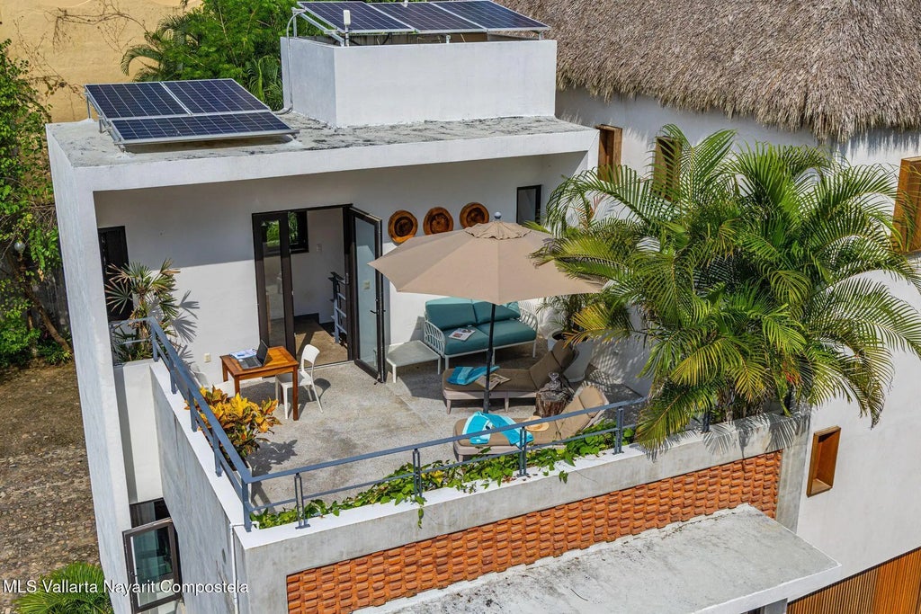 This perfectly designed small home is just steps from the sand in the coveted Costa Azul neighborhood in San Pancho. Walk to the beach club and view famous beach sunsets from your patio. This one bedroom, 2 bathroom home is the most affordable in the surrounding area and is ideal for a couple or as a desirable rental. The house has almost no maintenance, so it's great for a vacation home. It features custom hardwood cabinetry and doors, laundry room, solar panels, large entertaining patio, ocean views of famous San Pancho sunsets, a generous garage with beautiful hard wood Parota door, and sits in a quiet cul de sac just steps from the beach.Esta pequeña casa perfectamente diseñada está a solo unos pasos de la playa en el codiciado vecindario Costa Azul en el extremo norte de la playa de San Pancho. Camine hasta el único y exclusivo club de playa ú observe las famosas puestas de sol desde su patio. Esta casa de un dormitorio y dos baños es la más asequible en el área circundante y es ideal para una pareja o para manejar como alquiler de un valor deseable. La casa casi no requiere de mantenimiento, por lo que es ideal para una casa de vacaciones. Cuenta con gabinetes y puertas de madera personalizados, lavadero, paneles solares, un gran patio de entretenimiento, vistas al mar y sus famosas puestas de sol, un amplio garaje con una hermosa puerta de parota de madera y se encuentra en un tranquilo, silencioso y peculiar callejón sin salida a solo unos metros de la playa.