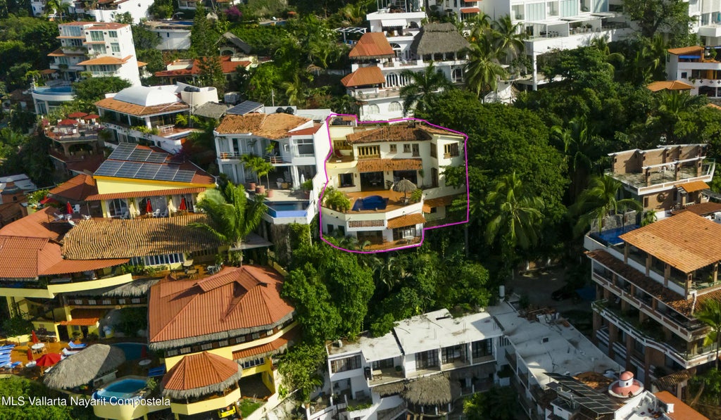 Nestled amidst lush greenery, this stunning 3-level home combines timeless Mexican architecture with modern functionality which is the design of Cashi Perez who is a renowned architect of Puerto Vallarta. Situated on a 595.98m lot, it offers 4 bedrooms, 4.5 bathrooms, and breathtaking ocean and city views. The ground floor features a private unit with its own gourmet kitchen, living area, bedroom, full bathroom, half bathroom, and balcony. The second floor, perfect for entertaining, includes the main kitchen, living room, pool, palapa, and an additional bedroom and bathroom. The top floor is dedicated to two spacious bedrooms, each with an ensuite bathroom. Surrounded by vibrant trees and set on a quiet street, this home offers unparalleled privacy and charm.Ubicado en medio de una