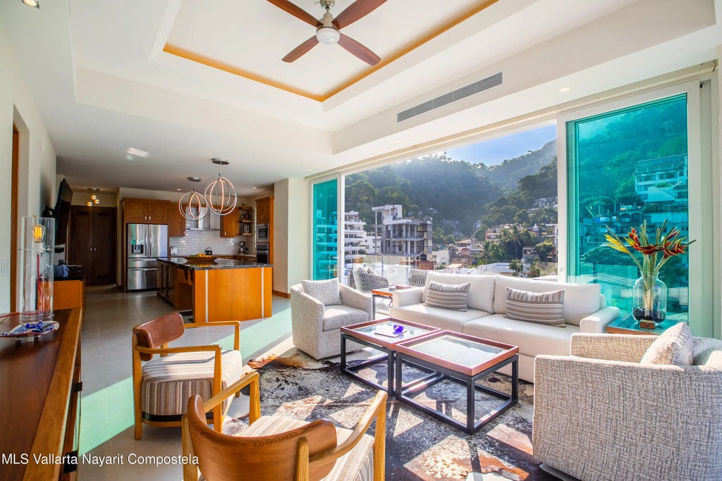 Step into luxury with V Estrella PH1, a home designed to impress. From the moment you enter, the custom kitchen becomes the star of this 2,146 sq. ft. corner residence. Featuring an extended island with storage, wine and beverage coolers, and a stunning black-and-gold marble countertop, it's both functional and breathtaking. The bright, open living area flows to a large wraparound terrace with floor-to-ceiling sliding doors, offering majestic mountain, city, and ocean views. Outdoors, a full-size dining table creates the perfect space for entertaining. The primary bedroom boasts an en-suite bath and walk-in closet, while the guest room with a Murphy bed ensures comfort for all. With 2.5 baths, this penthouse is ideal for retirement, investment, or a vacation escape in beautiful Vallarta.