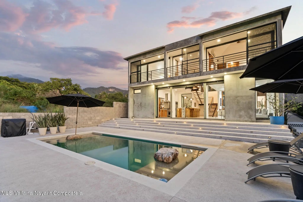 (English below) Hermosa villa con arquitectura contemporanea en la zona de Litibu, Higuera Blanca. Esta maravillosa propiedad, construida sobre un terreno de 1,027.57 m, esta cercada por un porton electrico. Cuenta con una espectacular arquitectura contemporanea en concreto aparente con acabados en estuco, pisos de cemento pulido, techos altos de mas de 3 metros que aportan frescura al espacio, y ventanas anti-huracan con vistas al jardin y la zona de la piscina. Las ventanas del segundo piso ofrecen vistas al mar y la selva, permitiendo contemplar la puesta de sol sobre la maravillosa Bahia de Litibu.Villa Loma Litibu tiene 348.57 m construidos. La casa principal, en la planta baja, cuenta con una hermosa cocina abierta con vista al jardin y la puesta de sol, una amplia barra de desayuno hecha de Parota sólida de la zona, una gran sala de estar con medio baño, un área de lavandería con mueble de Parota para almacenamiento, cuarto de lavado y otro medio baño. En el primer piso, al que se accede por una hermosa escalera de hierro contemporáneo, iluminada por un hermoso candelabro contemporáneo de gran formato y peldaños de madera, se encuentra un pasillo que da acceso a los dormitorios, aportando gran frescura al espacio. Este nivel tiene dos amplias habitaciones principales con vista al mar a través de un balcón que conecta ambas habitaciones. La casa cuenta con aire acondicionado en la sala, comedor y habitaciones principales.