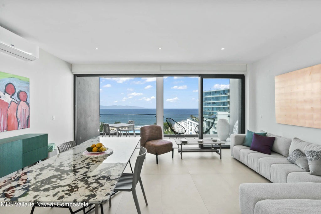 Beautiful beachfront condo located on the pristine beach of Nuevo Vallarta at Aria Ocean ( The new tower just delivered 2023). This unit is located on 9th floor and has 2 balconies. Front balcony with Amazing ocean view and back balcony with mountain views. The wide sandy beach and calm surf invites you to come take a dip in the warm water or simply lounge around one of the two large infinity pools or the smaller pool set right on the sand. This 2 bed, 2 bath condo with extra space could turn in to 3rd bedroom has also 1 deed parking.There are 2 balconies one with amazing ocean views and back balconies with lovely mountain views that you can admire . The beautiful grounds are filled with palm trees, plants, flowers and a large fountain make this a truly calming space.Beach front e