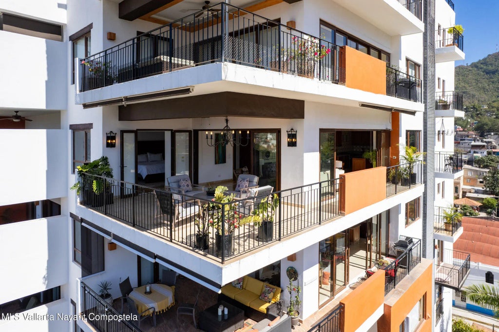 Very large and spacious apartment on an upper level on the south corner with floor-to-ceiling windows and doors around a substantial wrap-around terrace with expansive views of the mountains, the ocean, and the Rio Cuale. Large remodeled kitchen is fully equipped. Three bedrooms three bathrooms. Garage parking space and bodega included. Direct and secure elevator access. Common areas include lush tropical gardens and a newly constructed swimming pool. Comfortable and peaceful environment.