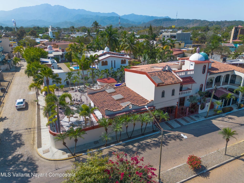 Casa Rincon de Guayabitos is located just a few blocks away from the beach on the main Avenida del Sol thoroughfare. The location offers a perfect balance of accessibility to the local vibrant scene and tranquility. This spacious 3 bedroom 5 bath home is located on a double corner lot with access on both sides affording ample space and privacy, ideal for full-time living or as a vacation retreat.A natural flow between the covered outdoor spaces, pool, and bright and open floor plan living creates a welcoming and warm atmosphere great for entertaining guests or the ease of hosting a large family. One of the unique features of the home is the beautiful mosaic work throughout the property, which will remain as part of the sale, adding a touch of local artistry to every room.The back patio space is designed with both hardscape and mature drought-resistant plants which is the perfect combination for maintaining such a large yard. A true gem of this property is the double car garage, that could be a bonus work space or serve as a lock off unit for cars and personal possessions. Each of the 3 bedrooms are located on the second story of this property to avail mountain views which can be accessed through their prospective balcony spaces. Along with a fully built in office that could serve as a second family room, the upper level boasts a terrace offering an ideal setting for relaxation and entertaining. Sold fully furnished, the home is move-in ready, with tasteful furnishings that complement the overall charm of the space.