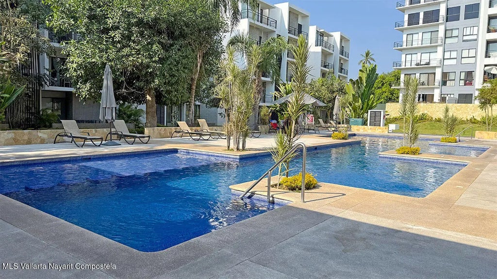 Cuenta con dos recamaras, dos banos, sala, comedor, cocina integral equipada, estacionamiento, jaula tipo bodega. Esta localizado en planta baja y se entrega completamente amueblado. Ademas el desarrollo cuenta areas comunes como alberca y area infantil de juegos.It features two bedrooms, two bathrooms, a living room, dining area, fully equipped kitchen, parking space, and a storage cage. It is located on the ground floor and is delivered fully furnished. Additionally, the development includes common areas such as a swimming pool and a children's play area.