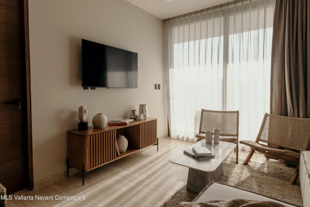 Unit 111 in Tower 1 is a bright and contemporary 2-bed, 2-bath residence on the first floor, with private elevator access opening directly into the unit. It features an Italian-style kitchen with granite countertops and Parota wood cabinetry, a spacious living area, a master suite with walk‑in closet, and a second queen-sized bedroom. Two interior terraces offer a serene oasis--one complete with a private plunge pool. The development offers extensive amenities such as a rooftop infinity pool and bar/lounge, fitness center with yoga deck, family pool, hammock lounge, surfboard storage, co‑working space, kids club, pet garden, concierge and valet parking--with delivery scheduled for December 2025.