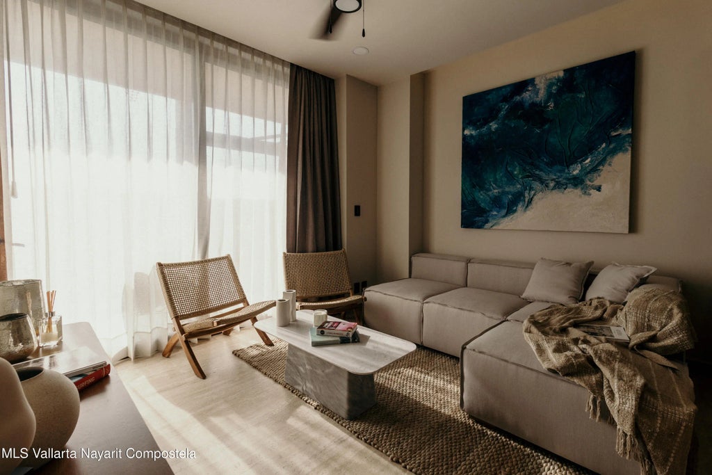 Unit 213 is a chic 2-bedroom, 2-bathroom oasis tucked into the treetops above Sayulita. It features an open-concept Italian-style kitchen with stone countertops, living and dining area that flow onto a private terrace. The master suite includes a king bed and en-suite bathroom, while the second bedroom comfortably accommodates guests. With premium finishes, hardwood accents and smart lighting, the unit seamlessly blends indoor comfort with outdoor tranquility. Residents also enjoy access to shared amenities like a rooftop infinity pool and bar/lounge, fitness center, family pool, hammock lounge, surfboard storage, co-working space, and concierge services.