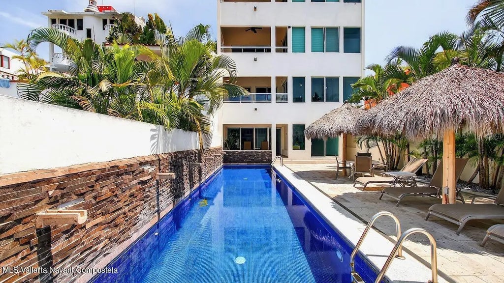 This spacious condo feels like a home! On the main level it offers a bright open layout, high ceilings and primavera cabinetry. There are 3 sizeable bedrooms, 3 bathrooms, and a covered balcony for outdoor dining that provides city, mountain, pool and palm views. There is also a lower level flex room and another covered patio overlooking the swimming pool. This Bucerias condo boasts a chefs dream kitchen with pantry, large island, granite countertops and an upgraded fridge. The master bedroom features a walk-in closet, dual sinks in the ensuite and a custom built corner desk. It has a laundry room with a full size washer and dryer, a new hot water tank and a water filtration system, as well as room for storage. This condo comes with 1 secured parking space and is sold furnished turn-key. The pool gets ample sun, is perfect for swimming laps and has a poolside lounge area complete with 2 palapas, a common area room. The rooftop provides panoramic views of the entire area. Contact us today about this beautiful home.