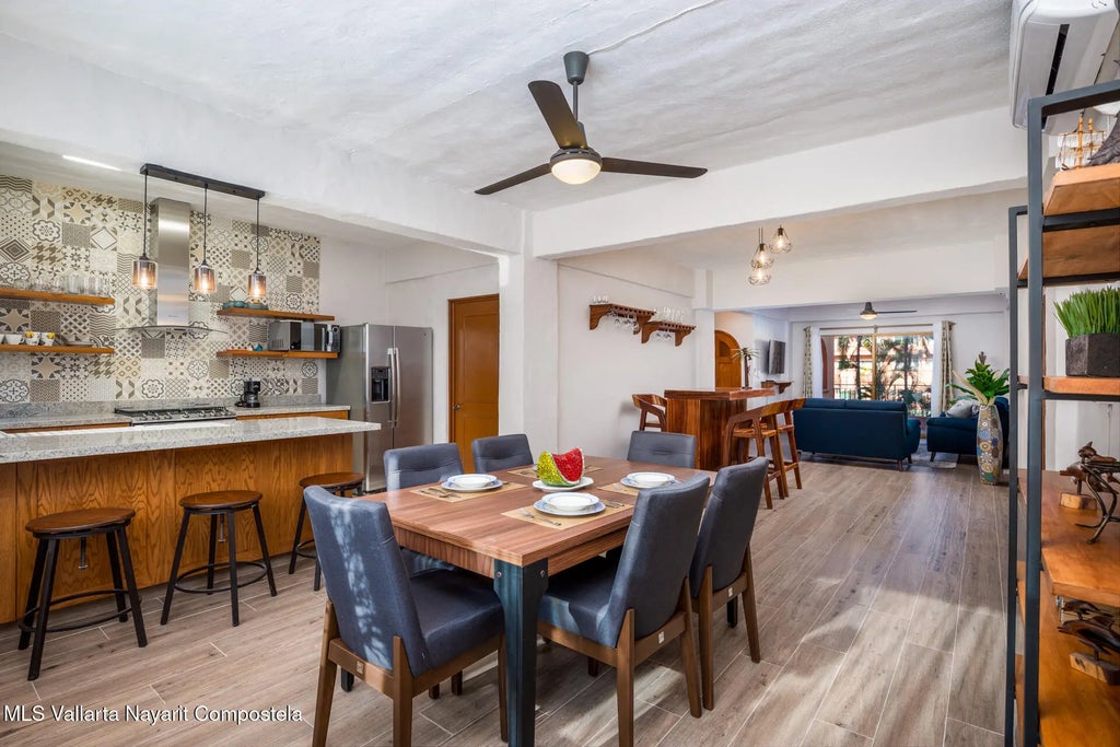 Puesta del Sol 4220 en Marina Vallarta - condominio de 2 recamaras y 2 banos, con sala, comedor, cocina, patio de servicio y terraza con vista a la cancha de tenis. Amenidades: alberca con palapa, canchas de tenis, jardines, area infantil, estacionamiento subterraneo y seguridad 24/7. A una cuadra de la playa, 10 min del aeropuerto, cerca de escuelas, restaurantes, tiendas y golf--- Puesta del Sol 4220 in Marina Vallarta - 2-bed, 2-bath condo with living room, dining, kitchen, service patio, and terrace overlooking the tennis court. Amenities: pool with palapa, tennis courts, gardens, kids' play area, underground parking & 24/7 security. One block from the beach, 10 min from airport, close to dining, shopping, schools & golf.