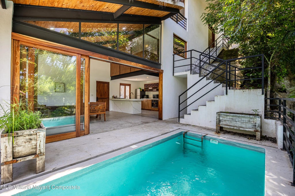 Nawalli Jungle Casitas is a stunning newly built home tucked away on the serene east side of Sayulita. Just a quick 5-minute golf cart ride from the vibrant town plaza and the popular Plaza Nawalli on the north side, this property offers both tranquility and convenience. Set on a 209.17 m lot with approximately 110 m of modern construction spread over three levels, this home is designed for comfort, style, and versatility.The street level features a 2-car garage, storage space, and a laundry area. On the first level, you'll find a bright open living space, a well-appointed kitchen, a refreshing pool, a full bath, and bedroom. The second level offers another bedroom with sweeping jungle views and a full bath.Topping it all off, the rooftop palapa boasts an enclosed glass-walled bedroom with its own full bath and breathtaking panoramic jungle vistas.